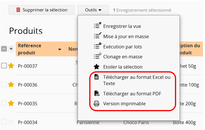 Vous pouvez exporter les fiches sélectionnées en les téléchargeant au format Excel ou CSV, en les téléchargeant au format PDF, ou en utilisant la version imprimable.