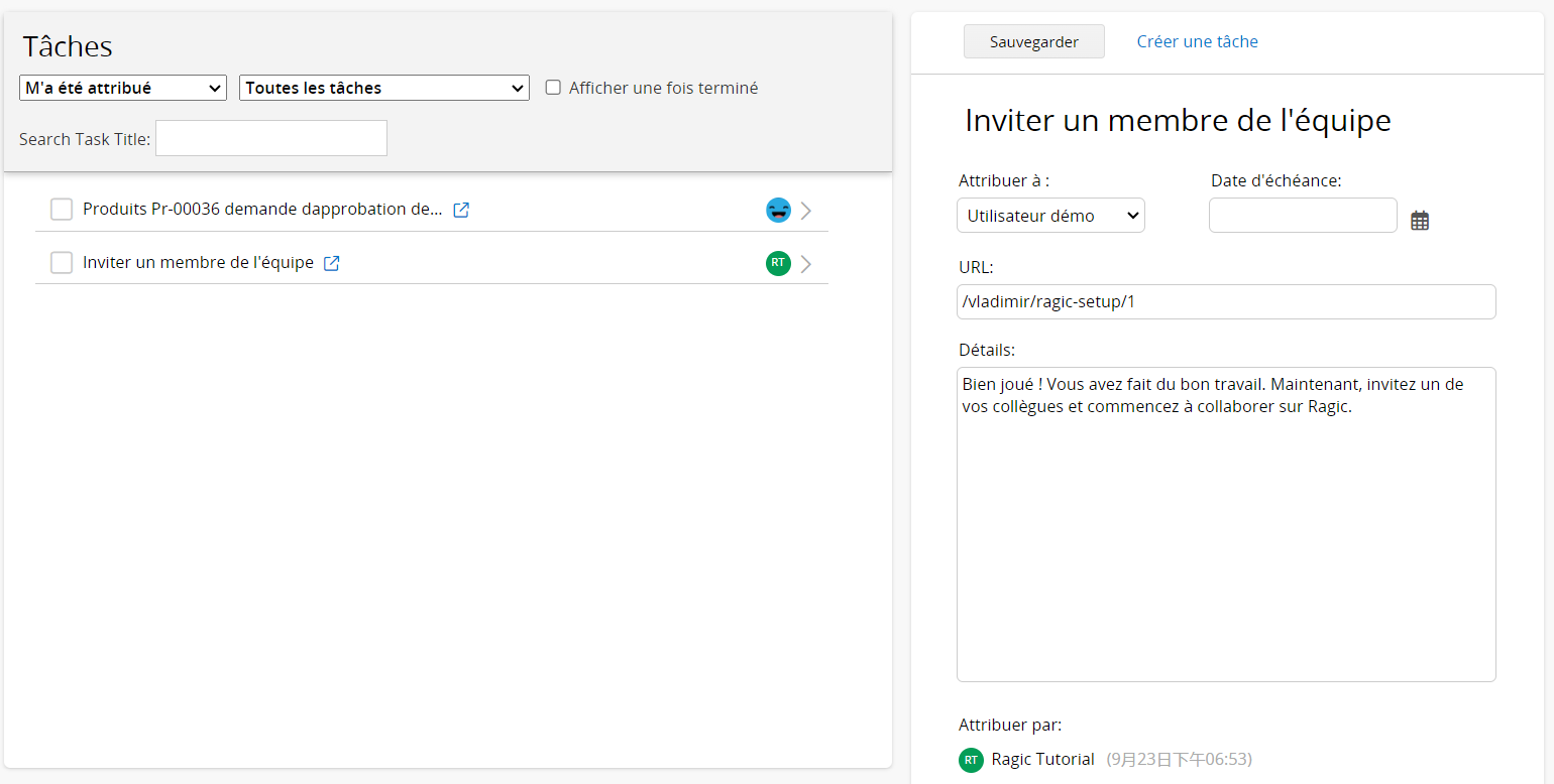 Une fois la tâche créée, l'utilisateur assigné recevra un e-mail et une notification par badge sur sa page Ragic.