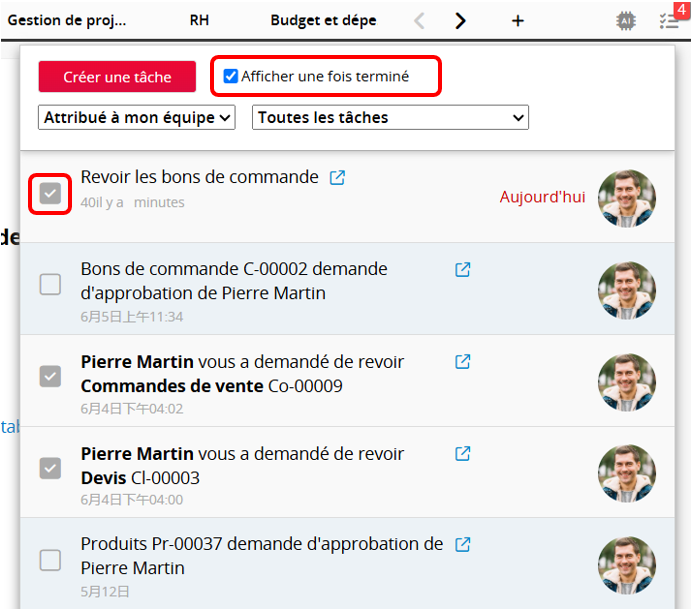 Lorsque d'autres utilisateurs débutent un flux d'approbation qui nécessite votre intervention, vous recevrez à la fois une demande par e-mail et une notification avec un badge sur l'icône des tâches. Une fois que vous avez terminé, le système marquera automatiquement cette tâche comme "terminée".