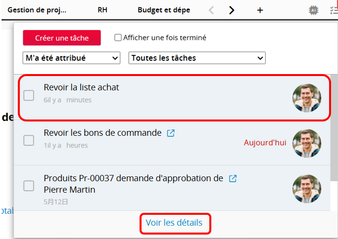 En cliquant sur l'un des éléments de la tâche ou sur Voir les détails en bas de la fenêtre des tâches, vous serez dirigé vers une nouvelle page où vous pourrez gérer toutes les tâches.
