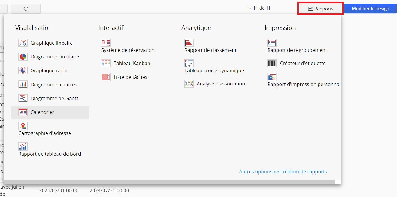 En plus des rapports sauvegardés et créés par votre SYSAdmin, vous avez également la possibilité de générer et de consulter vos propres rapports. Pour cela, il vous suffit de cliquer sur le bouton Rapport situé dans le coin supérieur droit d'une page liste, puis de sélectionner le type de rapport que vous voulez générer.