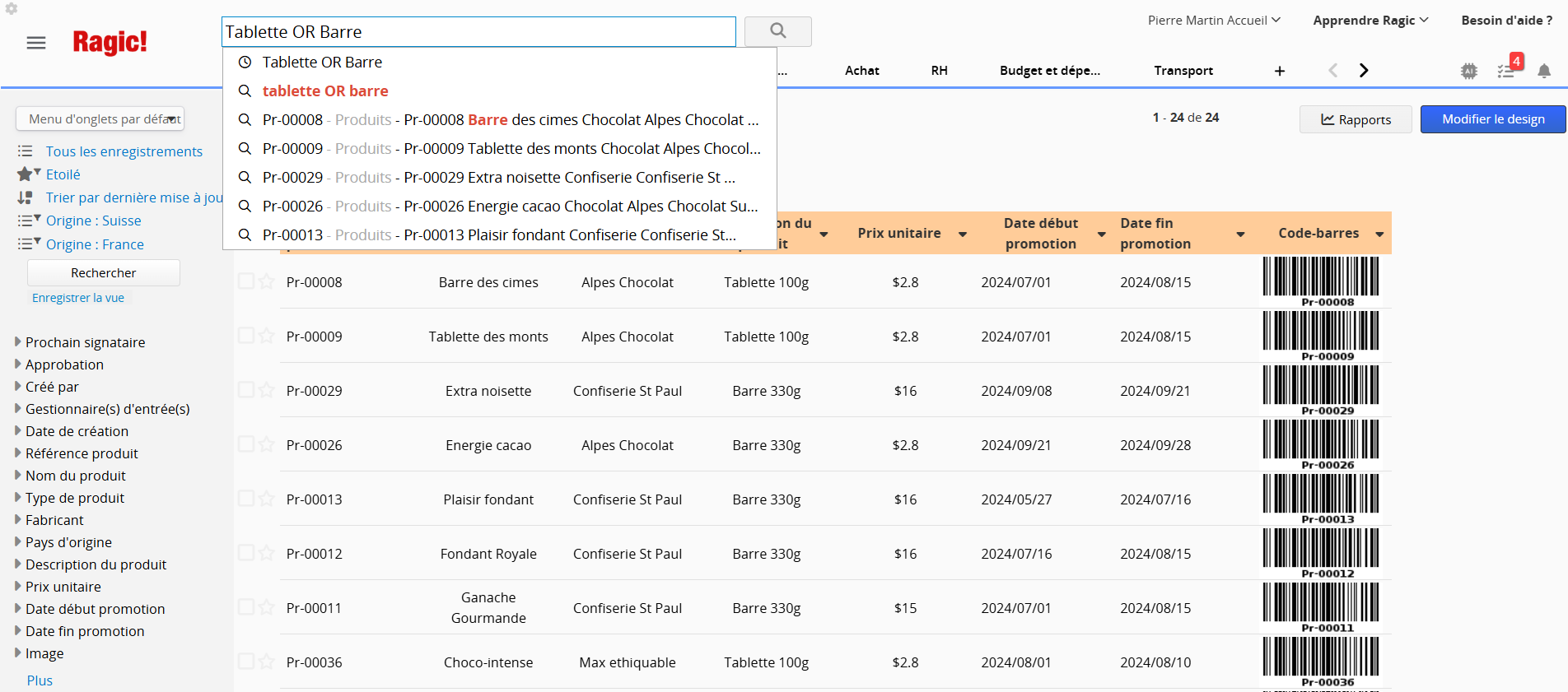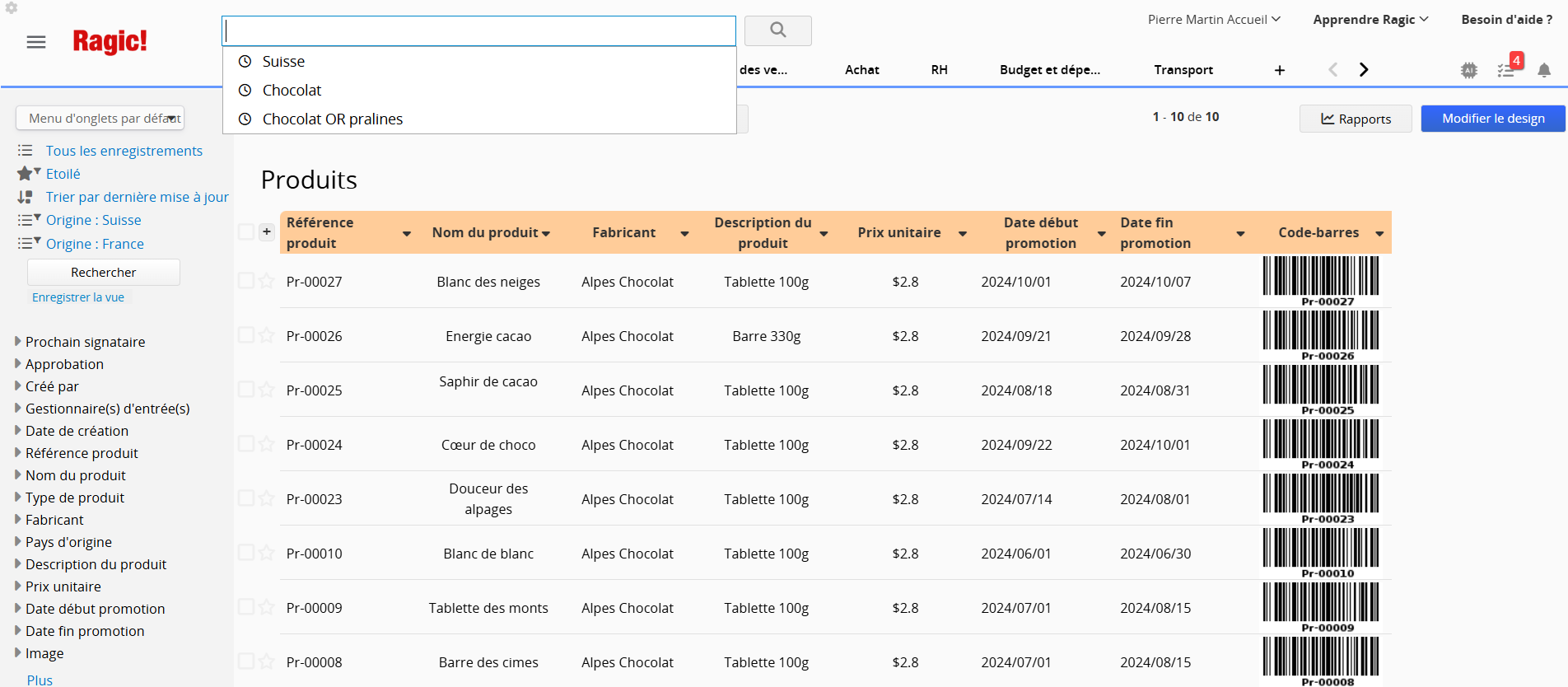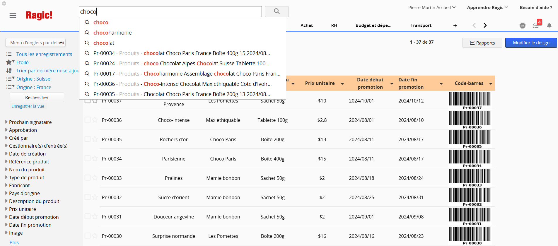 Par exemple, vous ne pouvez pas rechercher directement les trois derniers chiffres "001" si la valeur complète est "1234567001". Pour ce type de recherche, vous pouvez utiliser l'outil de recherche dans la barre latérale gauche ou filtrer par les en-têtes de champs.