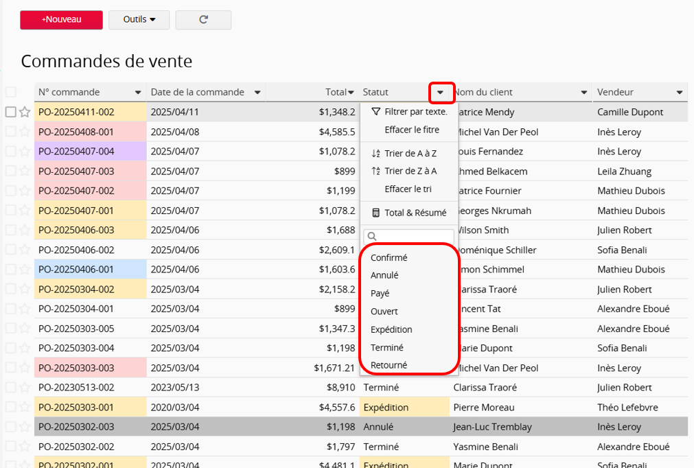 Sur votre page liste, vous pouvez cliquer sur les flèches situées du côté droit des en-têtes de champ pour filtrer les résultats affichés. Pour les champs de sélection, vous pouvez cliquer directement sur les options ci-dessous pour filtrer les enregistrements.