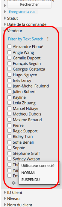 Si votre formulaire contient des champs de sélection d'utilisateur, vous pouvez cliquer sur l'icône d'engrenage dans le panneau latéral gauche pour filtrer par "Utilisateur connecté", "Normal" ou "Suspendu".