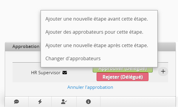 Pour ajouter des approbateurs ou des étapes d'approbation , cliquez sur l'icône "+" à côté des boutons d'approbation/rejet. Vous pouvez :