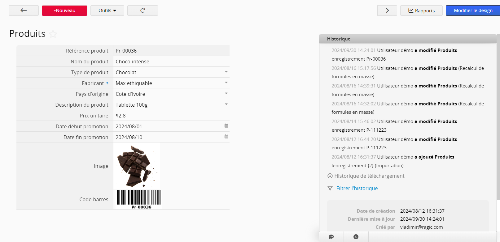 Ragic conserve dans le panneau d'informations de l'entrée l'historique d'un enregistrement, qui garde les traces de chaque modification et sauvegarde de l'enregistrement concerné.