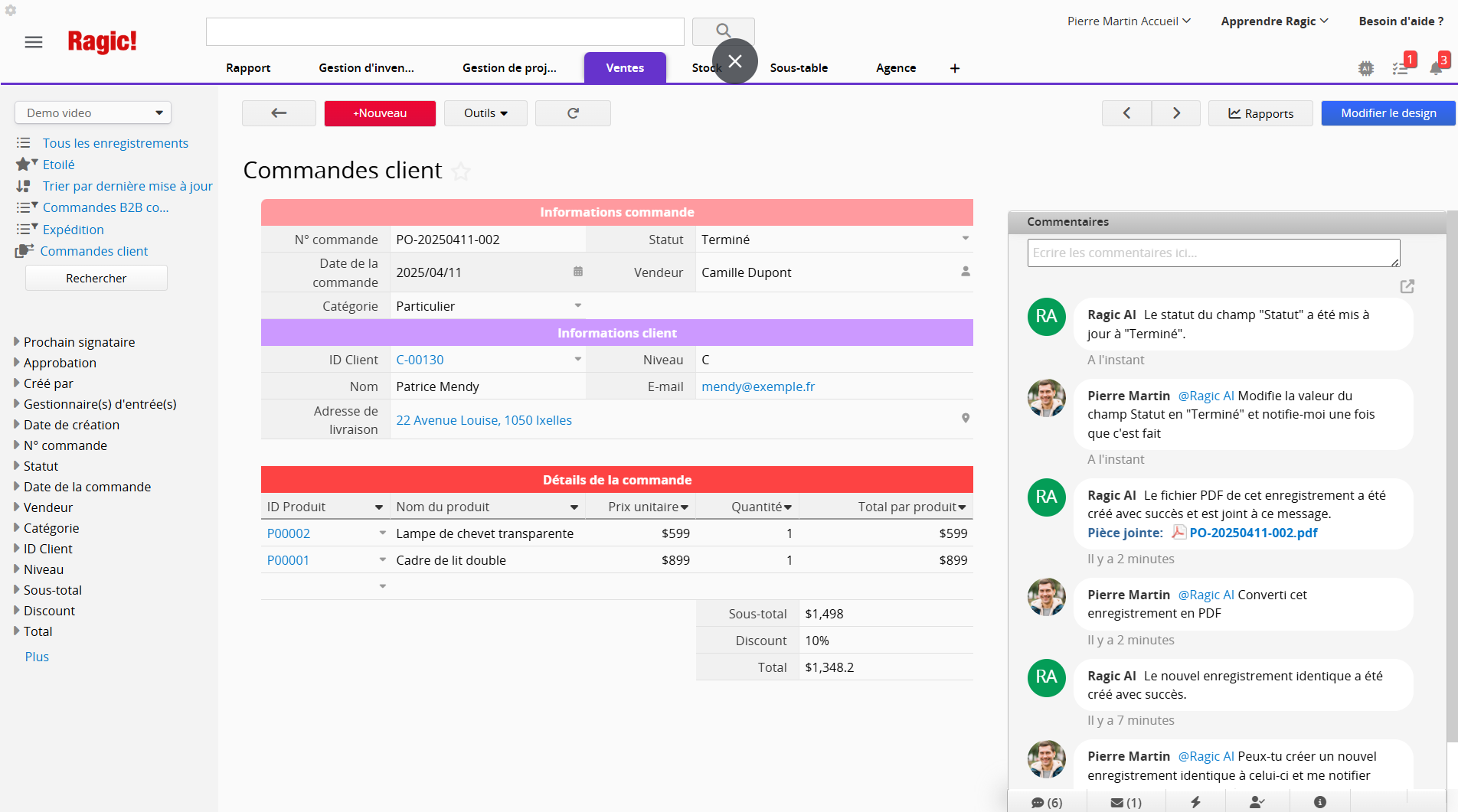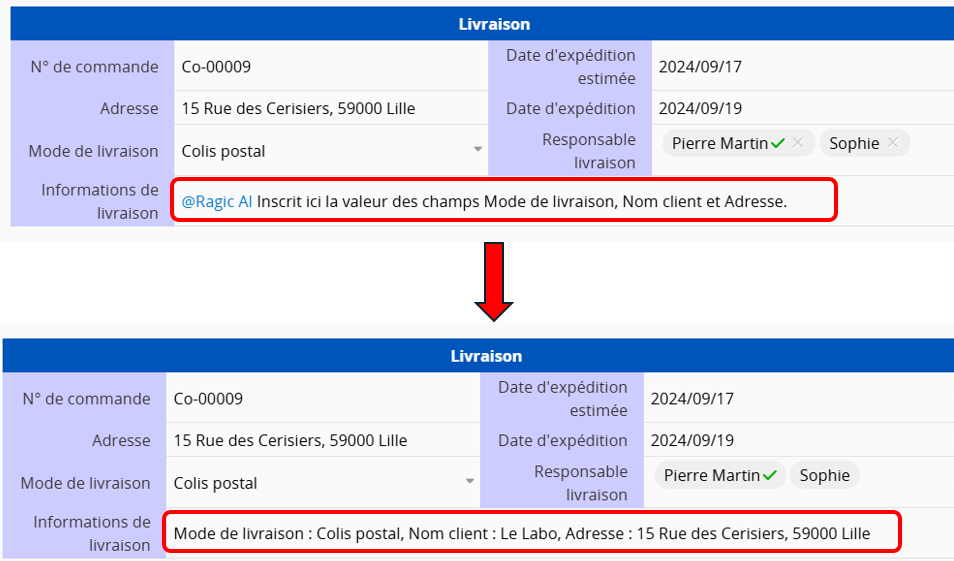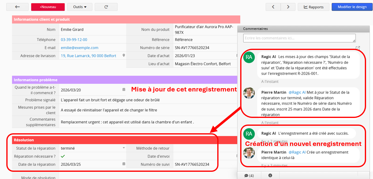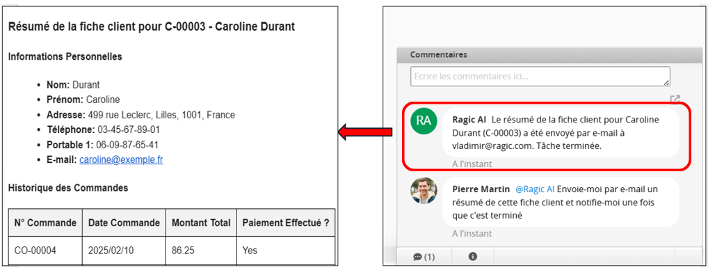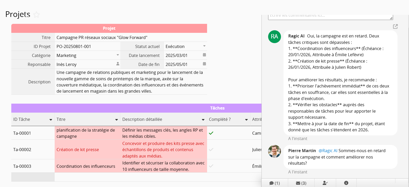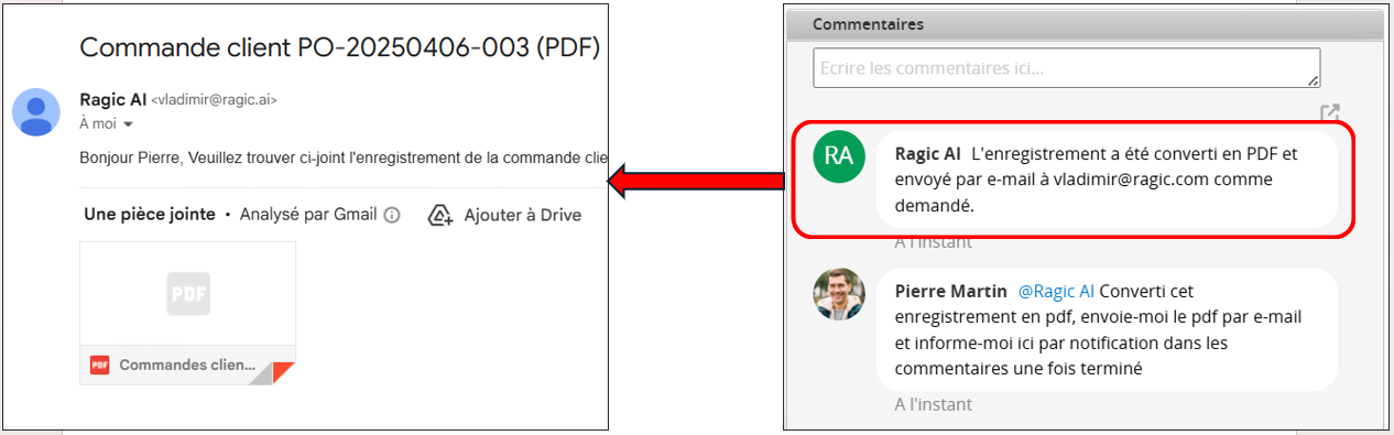 Les utilisateurs peuvent appeler l’IA en saisissant @Ragic AI avec la fonctionnalité Mention, soit dans la section Commentaires située en bas à droite d’une feuille, soit directement dans les champs de la feuille. Cela fonctionne de manière similaire à l’attribution d’une tâche à un collègue. Ragic IA peut analyser les données des feuilles, mettre à jour ou créer des enregistrements, exporter des fichiers et envoyer des e-mails afin d’améliorer l’efficacité opérationnelle globale.