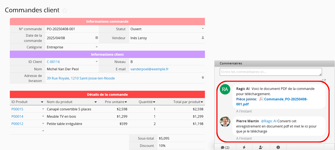 Permet d’exporter les données au format PDF ou Excel et de les envoyer aux adresses e-mail spécifiées ou aux champs e-mail de l’enregistrement, ou encore de téléverser directement les fichiers en tant que pièces jointes dans la section Commentaires.