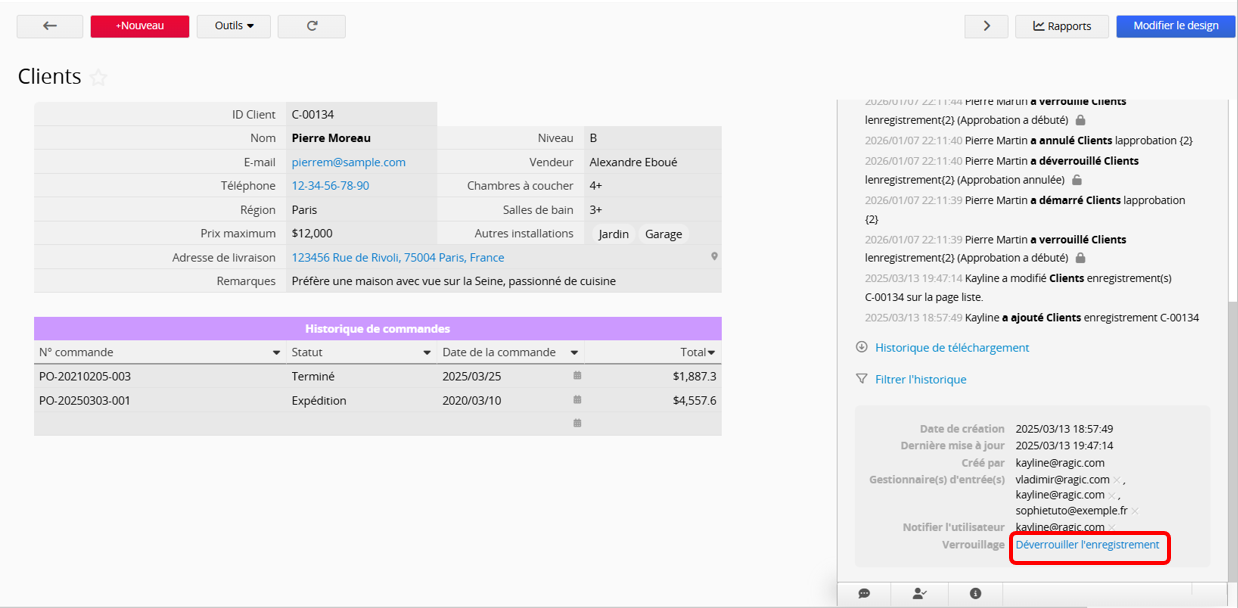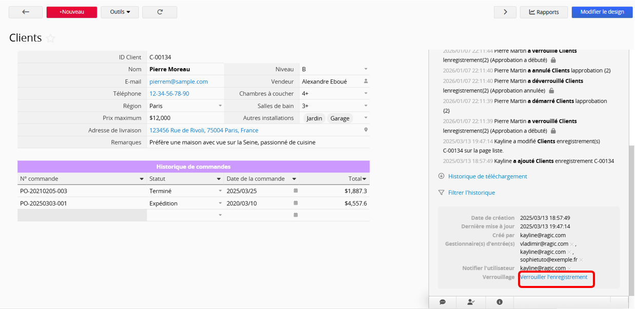 Pour empêcher la modification d’un enregistrement, vous pouvez verrouiller l’enregistrement manuellement. Vous pouvez également le déverrouiller à tout moment.