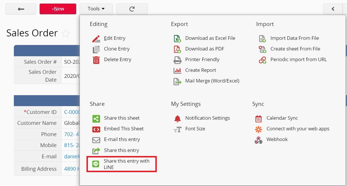 Vous pouvez partager des données par l'application LINE avec des utilisateurs qui n'ont pas de compte Ragic pour qu'ils puissent éditer ou consulter une entrée. Ainsi, vous pouvez partager un ordre de vente avec vos clients pour qu'ils puissent suivre l'historique de leur commande. Veuillez vous rendre sur Page formulaire > Outils > Partager cette entrée avec LINE.