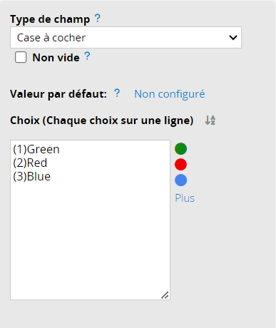 Pour trier les valeurs dans le champ de case à cocher sur la page liste, vous pouvez inclure leur ordre de tri entre parenthèses ( ). Cela ajoutera un numéro en préfixe à côté du nom de l'icône, facilitant ainsi le tri. Le texte entre parenthèses ( ) ne sera visible que dans le mode design.