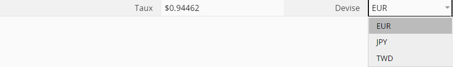 Lors de la saisie dans le champ, si vous sélectionnez "EUR" pour le champ "Devise", le système récupère automatiquement le taux de change correspondant.