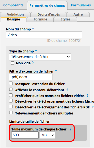 Vous pouvez définir la taille maximum de chaque fichier, la taille maximale actuellement prise en charge étant de 1 Go.