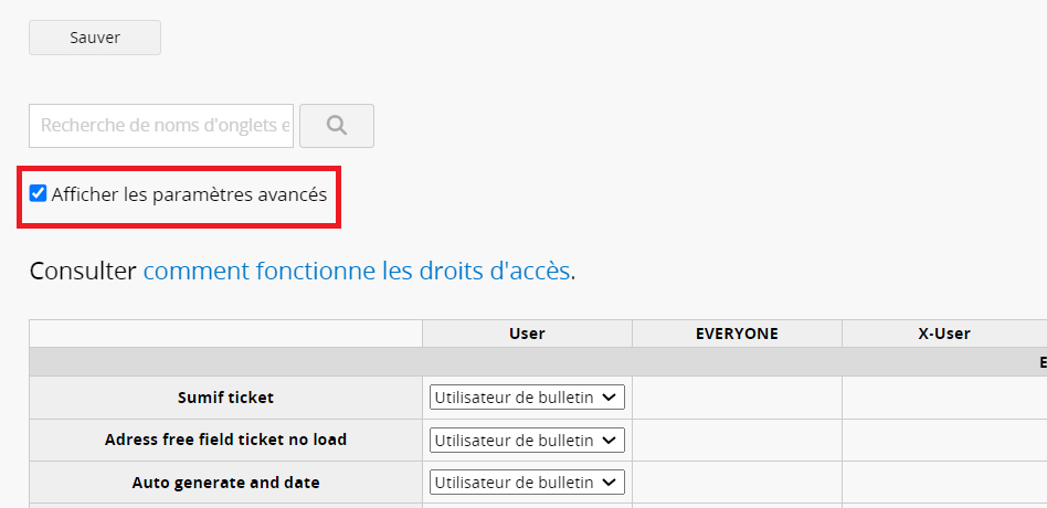 Vous pouvez à partir de là définir les droits d'accès pour chaque groupe d'utilisateurs répertorié pour cette feuille. Les privilèges d'accès qui sont définis sont spécifiés sur l'interface de configuration. Si un utilisateur appartient à plusieurs groupes, il accédera au formulaire avec le groupe qui lui accorde le plus de privilèges.