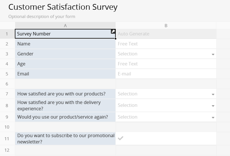 Créez une feuille Ragic qui corresponde à vos besoins. Comme exemple, créons ici une feuille "Enquête de satisfaction" avec les champs suivants :