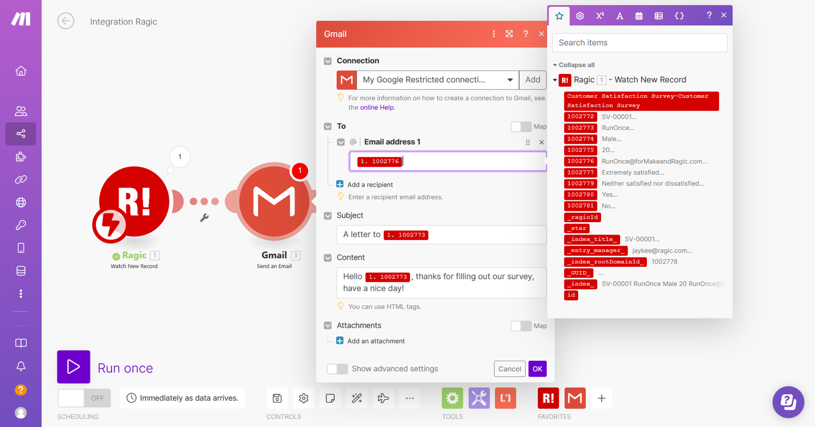 Relancez le scénario pour tester le processus d'envoi d'e-mail. Commencez par cliquer sur “Run once” et créez un enregistrement dans Ragic.