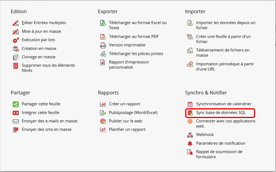 Sur la page liste, cliquez sur Outils et sélectionnez SQL Database Sync en dessous de Synchro & Notifier.