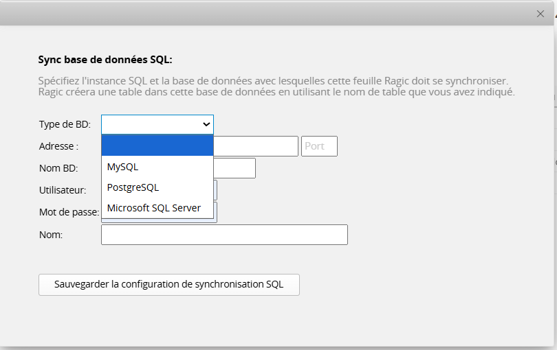 Sélectionnez le DB Type (type de base de données), saisissez les détails requis, et cliquez sur Save SQL sync config.