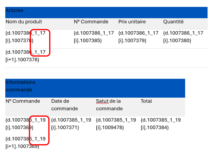Remarque : la syntaxe pour les champs indépendant et les champs de sous-table est différente.
