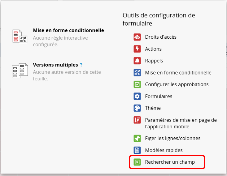 Lorsque qu’une feuille contient de nombreux champs ou plusieurs sections de feuille, il peut être difficile de localiser un champ spécifique une fois dans le mode design. La fonction Rechercher un champ vous permet de retrouver rapidement le champ ciblé lors de l’édition de la feuille.
