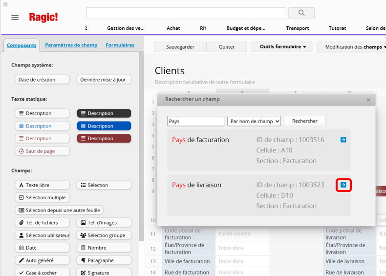 Si le champ se trouve dans une section, le système développera automatiquement cette section et se concentrera sur le champ sélectionné.