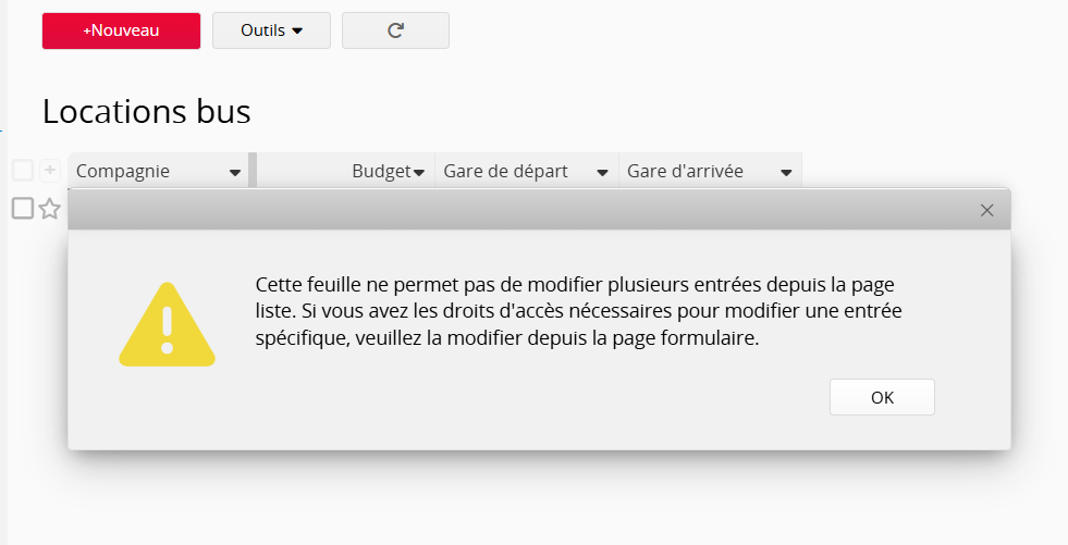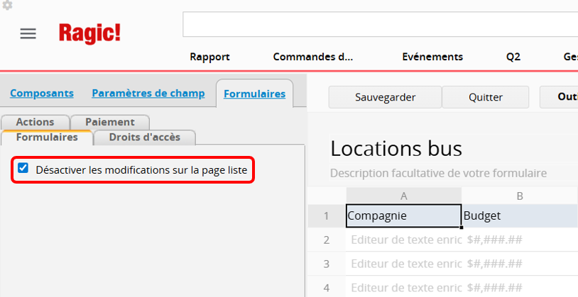 Parfois, les formules présentes sur la page formulaire peuvent ne pas exister sur la page liste. L’édition depuis la page liste peut alors empêcher le recalcul des formules. Pour éviter que les utilisateurs modifient manuellement les enregistrements depuis la page liste, vous pouvez cocher l’option Désactiver les modifications sur la page liste dans les Paramètres du formulaire du mode design de la page liste.
