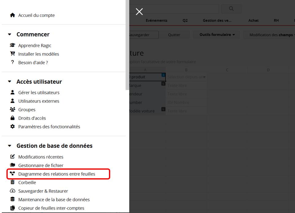 Accédez à l’icône à trois barres horizontales en haut à gauche de votre écrant et sélectionnez Diagramme des relations entre feuilles dans Gestion de base de données.