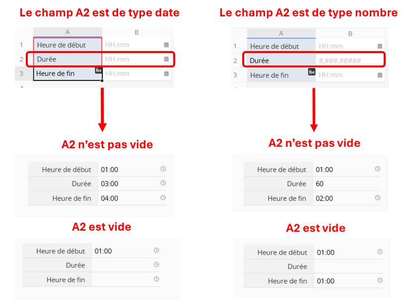 A1 correspond à "Heure de début" (HH:mm) et A2 à "Durée" (HH:mm). Pour calculer A3 "Heure de fin" (HH:mm) à l’aide de la formule "A2 + A1", si A2 est vide, la formule de A3 ne se déclenchera pas et A3 restera vide. En revanche, si vous modifiez A2 en champ Nombre (représentant la durée en minutes), A3 affichera toujours son contenu, même si A2 est vide.