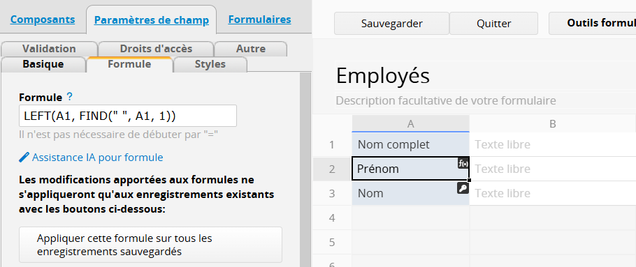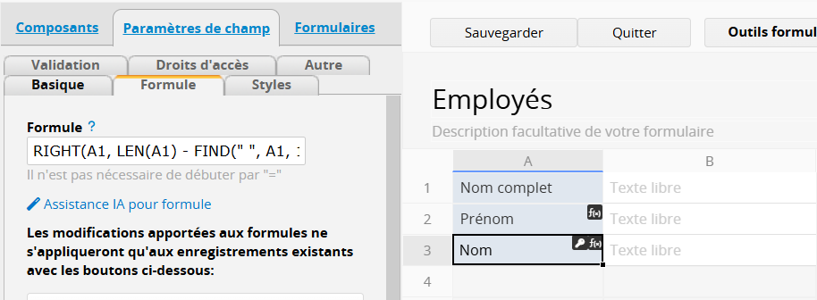 Si vous souhaitez afficher le prénom et le nom dans des champs séparés, vous pouvez utiliser les formules suivantes :