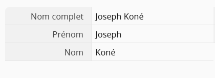 Par exemple, la valeur du champ "Nom complet" est "Joseph Koné".