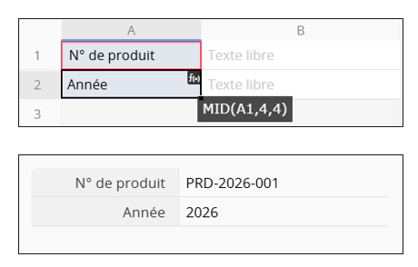 Si la valeur du champ "N° de produit" est "PRD-2026-001", où les quatre chiffres du milieu indiquent l’année, saisissez MID(A1,4,4) dans le champ "Année".