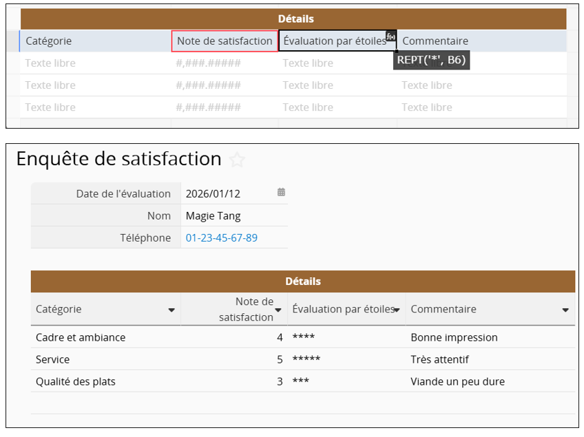 Dans le champ "Évaluation par étoiles", saisissez REPT("*", Note de satisfaction) afin de représenter la note avec des étoiles.