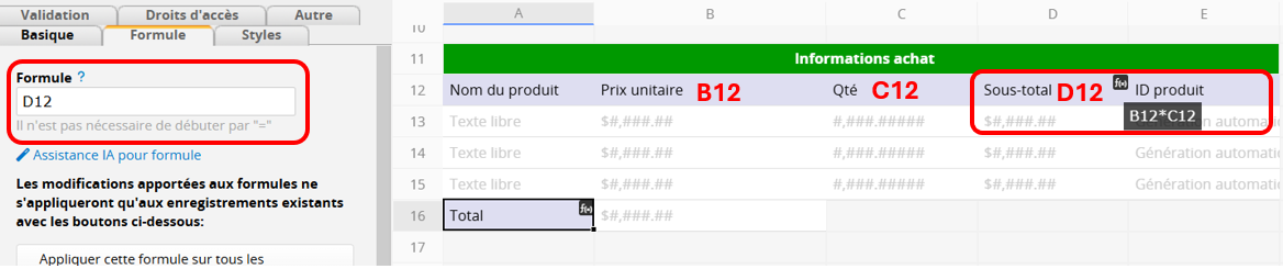 Attribuer des formules aux En-têtes de champs simplifie les calculs, surtout dans les sous-tables, où des formules complexes sont souvent inutiles. Voici un exemple de calculs dans la feuille "Commande client" : dans la sous-table, le Prix unitaire (B12) et la Quantité (C12) de chaque article sont listés. Multiplier ces valeurs fournit le montant (D12=B12*C12) dû pour chaque article. Ensuite, le sous-total dans le champ Total (A17) référence le montant total (D12) de la sous-table.