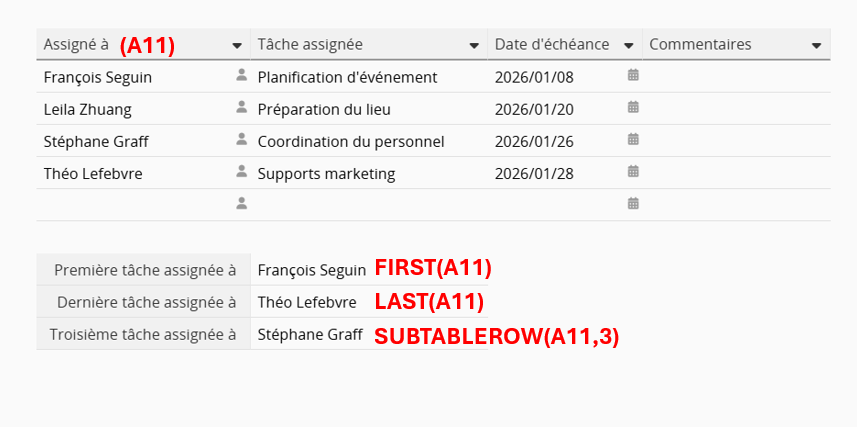 Utilisez les formules suivantes pour renvoyer la valeur d’un champ spécifique d’une ligne de sous-table. Voir le tableau ci-dessous.