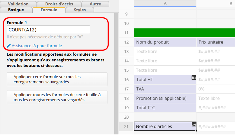 Les formules peuvent également être appliquées aux sous-tables elles-mêmes. Par exemple, si vous devez compter le nombre de lignes d’une sous-table, vous pouvez créer un champ séparé dans votre feuille utilisant la formule COUNT().