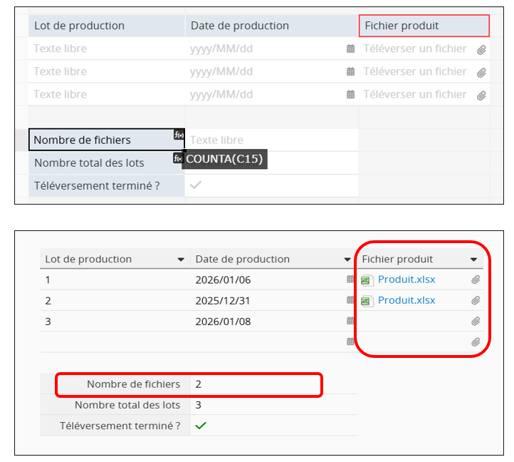 Exemple : dans une sous-table avec un champ Téléversement de fichier, chaque ligne peut inclure des fichiers attachés, tandis que les champs vides indiquent qu’aucun fichier n’a été téléchargé. Appliquer COUNTA(téléversement fichier) dans le champ Nombre de fichiers calcule rapidement combien d’enregistrements de sous-table contiennent des fichiers téléversés.