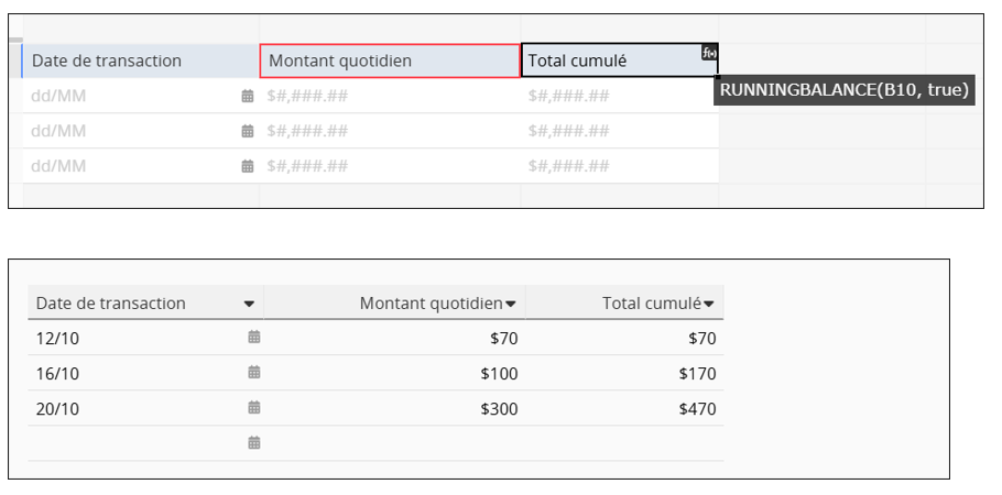 Dans le champ "Total cumulé" d’une sous-table, appliquez la formule : RUNNINGBALANCE("Montant transaction quotidienne",true)