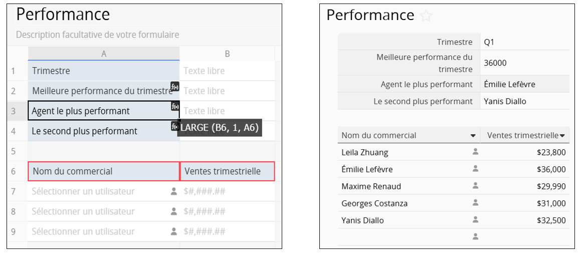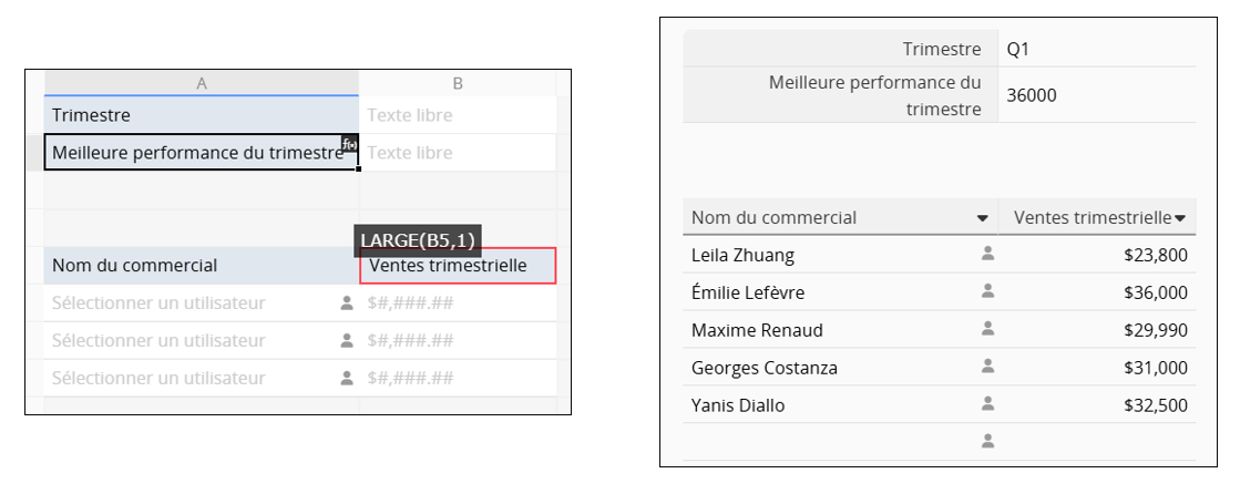 Pour obtenir le nom du commercial le plus performant, appliquez LARGE("Ventes trimestrielles", 1, "Nom du commercial").