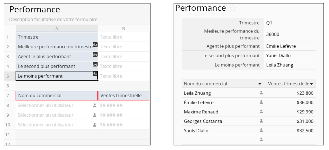 Dans une sous-table enregistrant la performance trimestrielle de chaque commercial avec les champs "Nom du commercial" et "Ventes trimestrielles" :