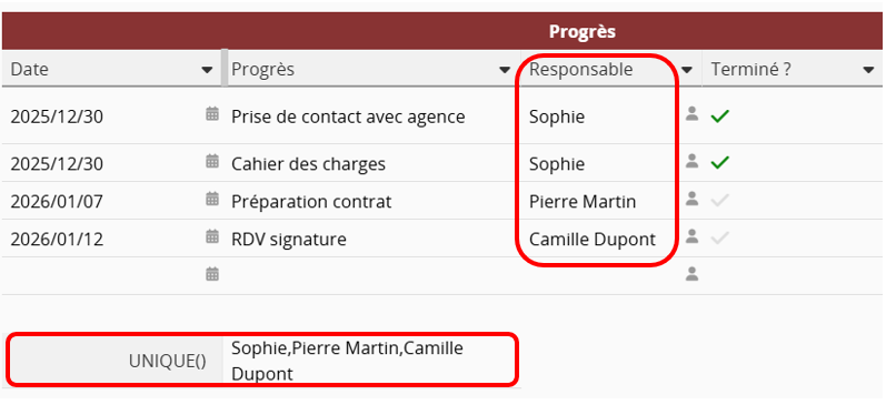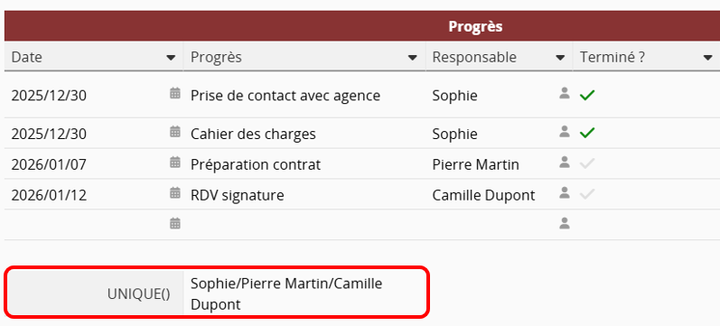 | UNIQUE() | Liste les valeurs uniques du champ de sous-table référencé. Pour plus de détails, cliquez ici. |