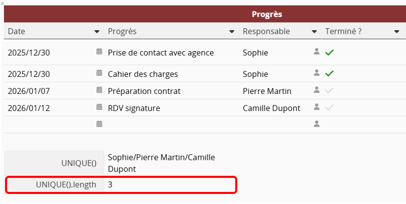 UNIQUE().length : Calcule le nombre de valeurs uniques du champ de sous-table référencé.