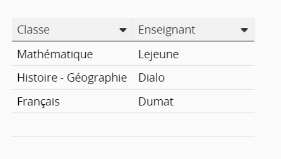 Pour trouver l’enseignant d’une classe spécifique dans la sous-table ci-dessous :