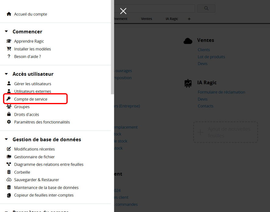 Cliquez sur l'icône à trois bandes en haut à gauche puis sélectionnez Compte de service sous Accès utilisateur.