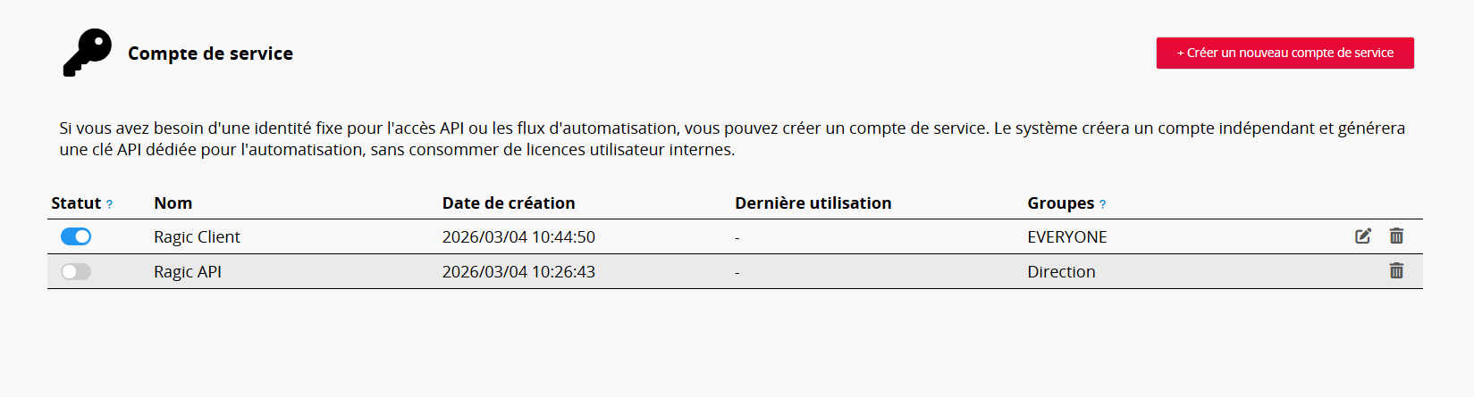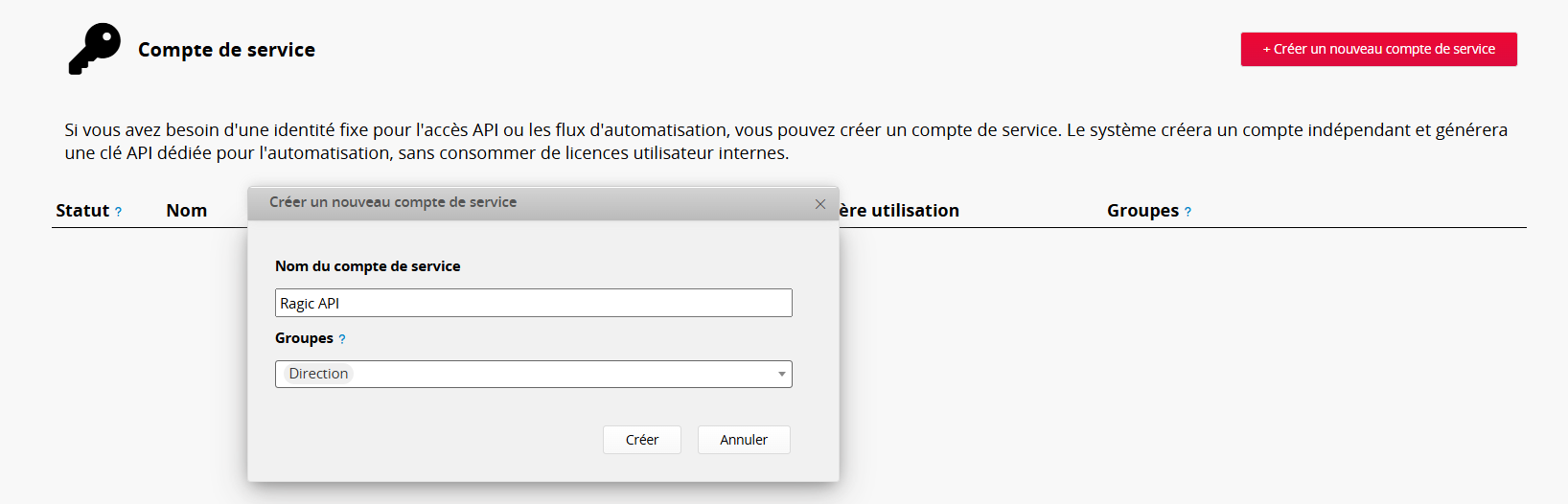Si vous avez besoin d’une identité fixe pour l’accès API ou des workflows d’automatisation, vous pouvez créer un compte de service. Le système créera un compte indépendant et générera une clé API dédiée à l’automatisation, sans consommer de licences utilisateur internes.