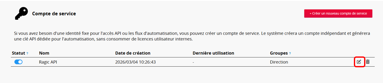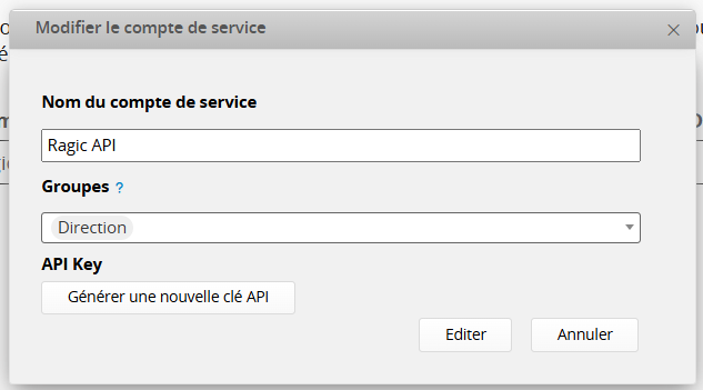 Cliquez sur Modifier à droite pour générer une nouvelle clé API ou modifier le Nom du compte de service et les Groupes d'utilisateur.