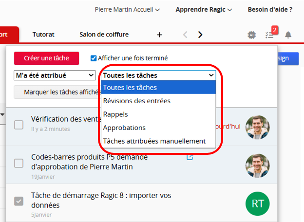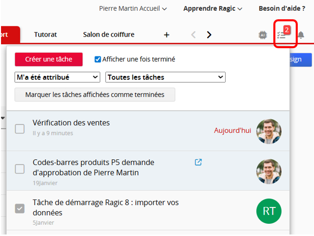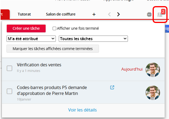 Cliquer sur l’icône Tâchesen haut à droite de la page affiche la liste des tâches à effectuer par les utilisateurs, classées par ordre décroissant. Les tâches peuvent être générées par le système ou attribuées manuellement. Une fois la case cochée, les tâches apparaissent en grisé et ne sont plus affichées dans la liste des tâches.