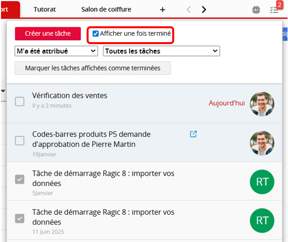 Vous pouvez afficher toutes les tâches terminées en cochant la case "Afficher une fois terminé". Décocher une tâche terminée la remet dans la liste des tâches en cours.