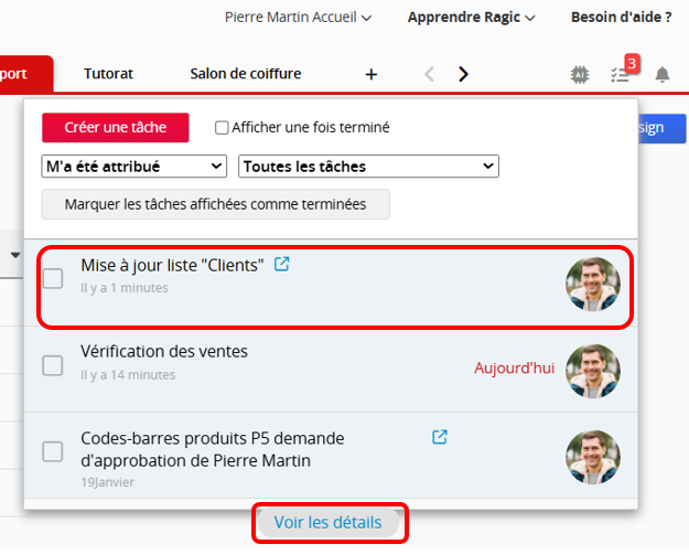 En cliquant sur l'un des éléments de tâche ou sur l'option voir les détails en bas de la fenêtre des tâches, vous serez dirigé vers une nouvelle page où vous pourrez gérer toutes les tâches.