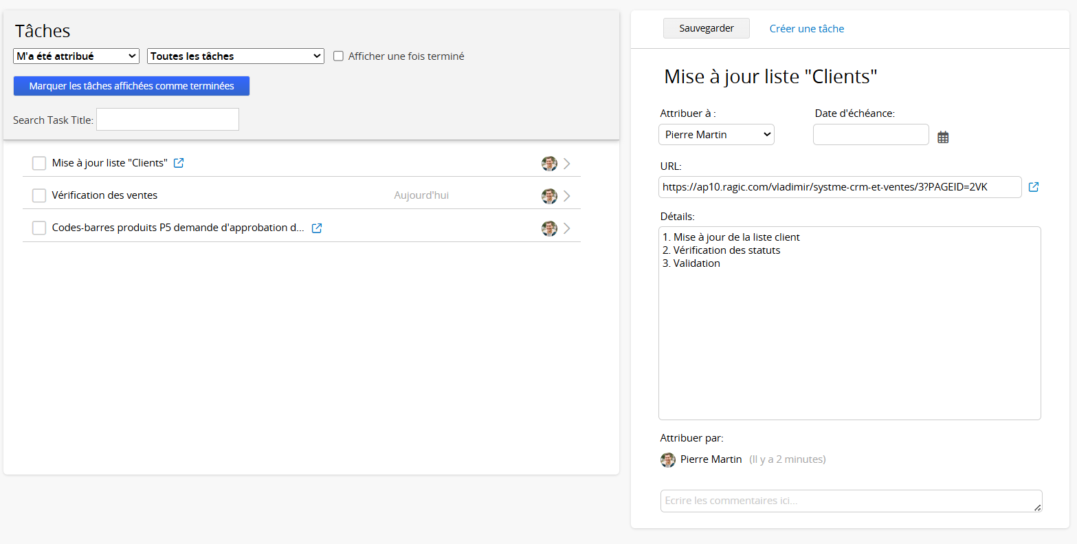 Sur la page des détails d'une tâche, vous pourrez voir qui a attribué la tâche et modifier la date d'échéance, l'URL, les détails et les commentaires.