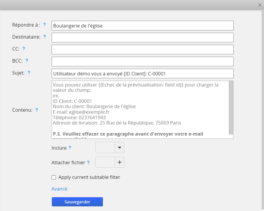 Cette fonctionnalité est particulièrement utile pour des cas d'utilisation tels que l'envoi de détails de confirmation de commande aux clients ou l'envoi de reçus d'achat aux fournisseurs.